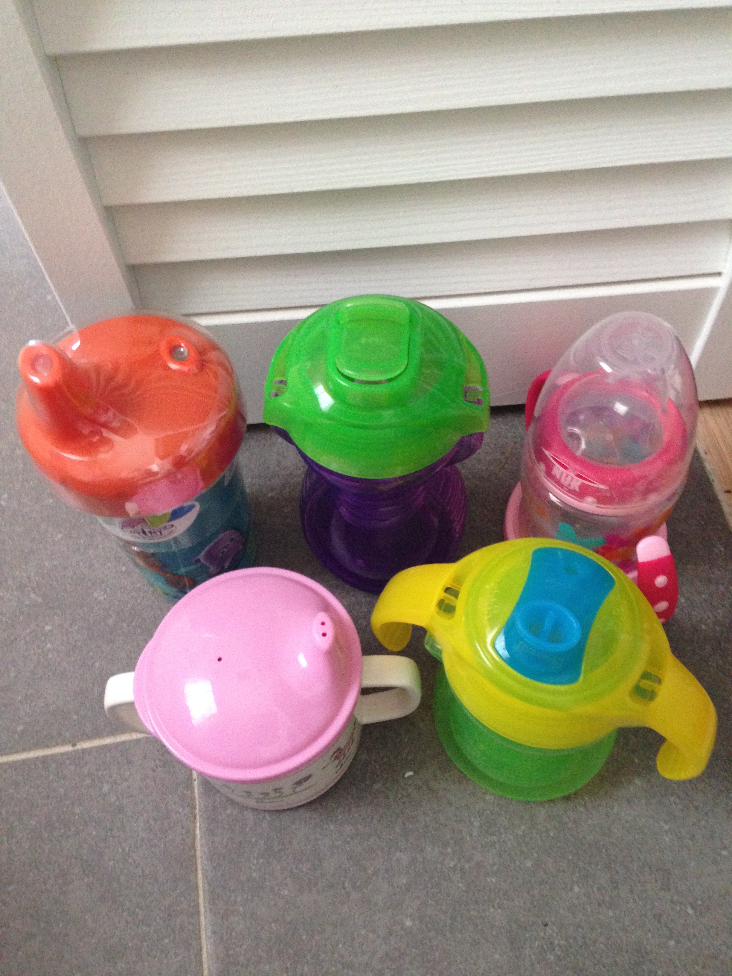 Here are a few sippy cups I have on reserve. I would personally chose the little pink one, if I was her. She received it as a Christmas gift from my aunt and uncle. What is cuter than a little, girly, almost vintage sippy cup with sweet, French vocabulary on it!